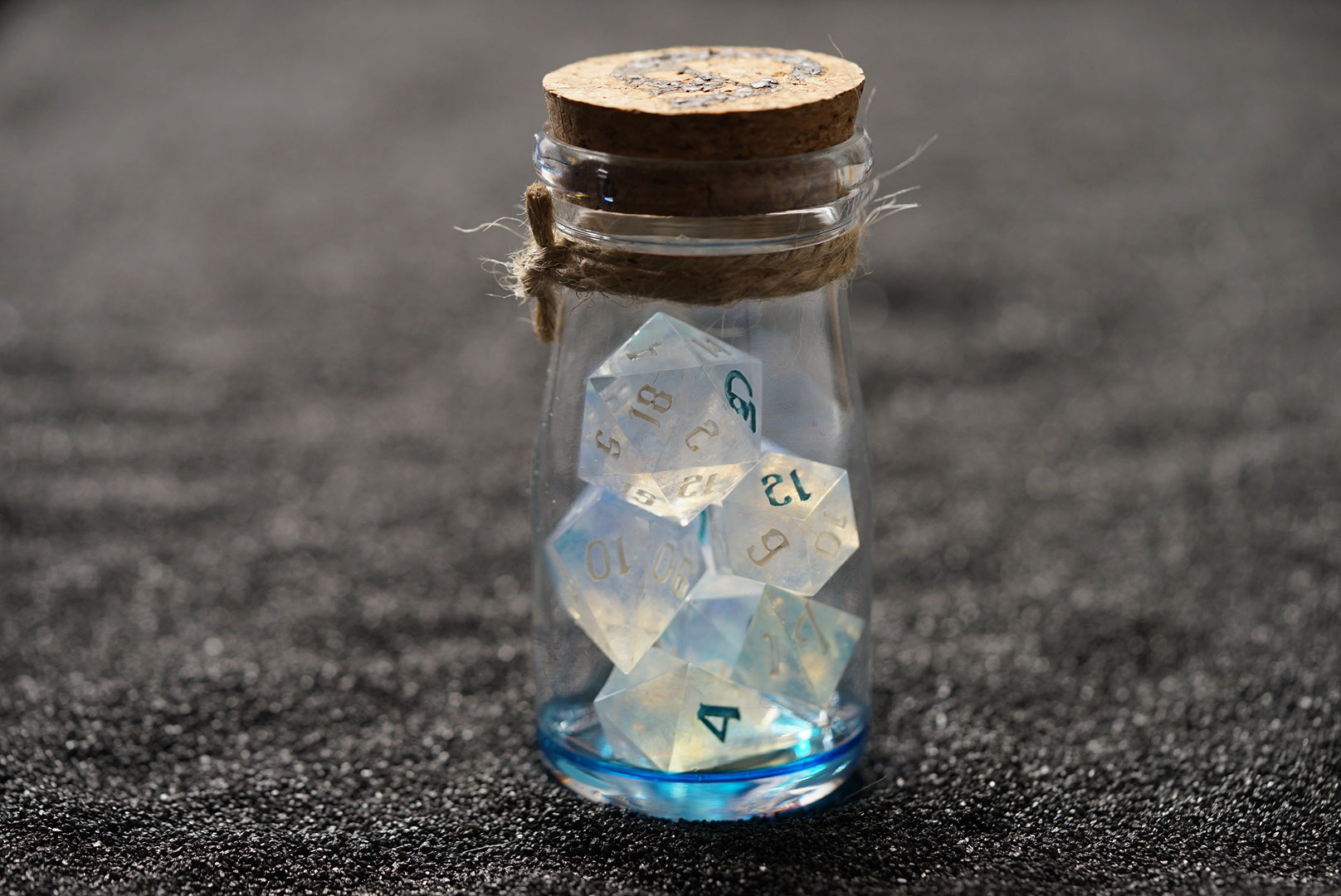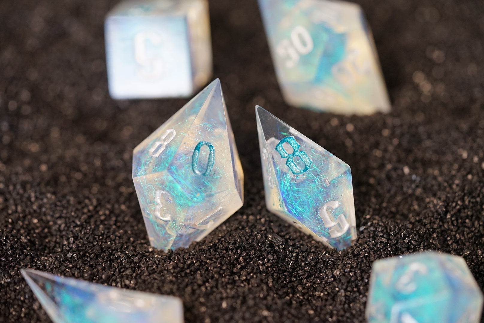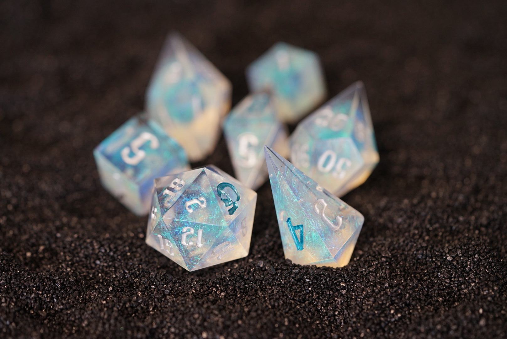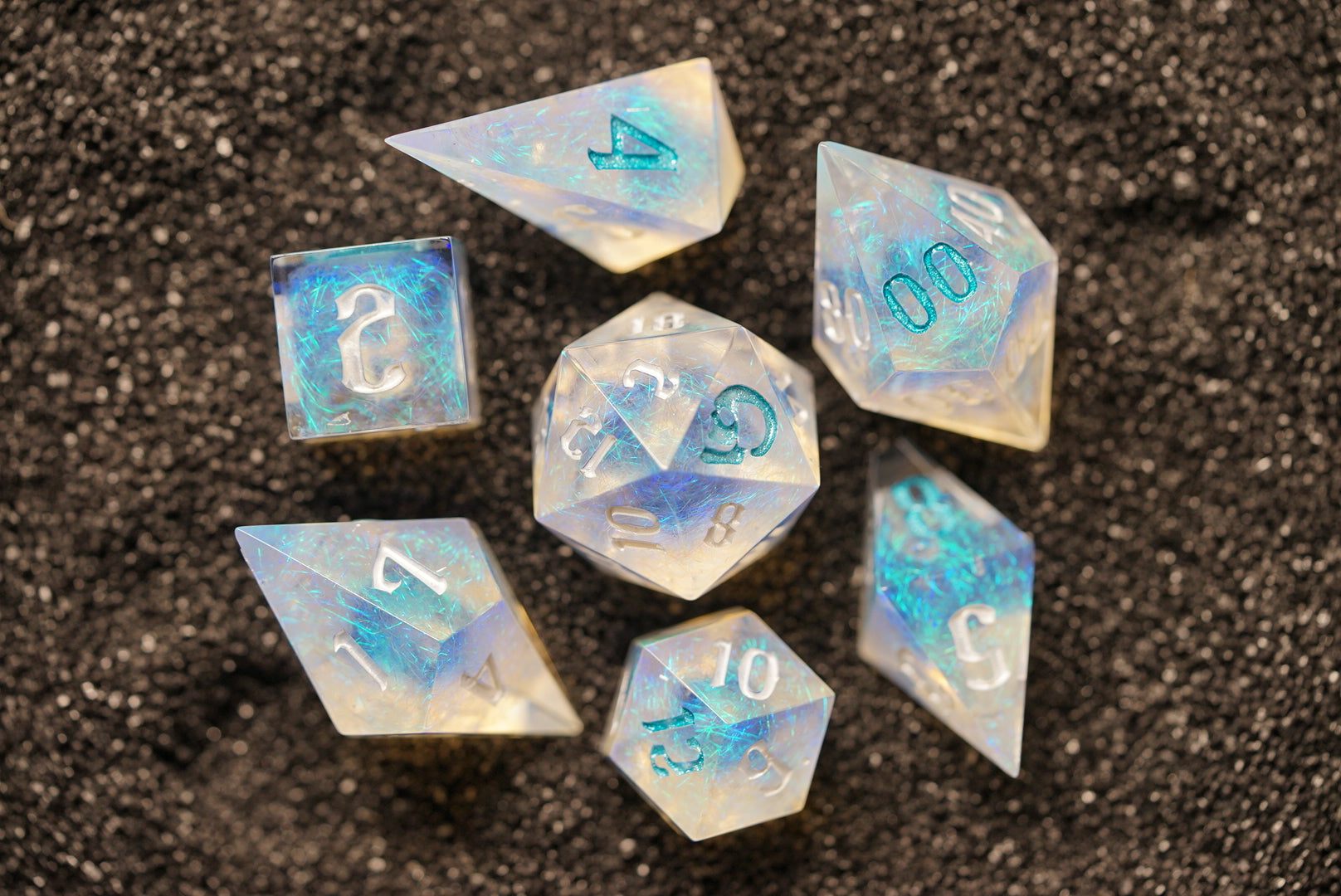 Crisp, chaotic, and definitely water-damaged. These dice roll like a tidal wave — sometimes they bless, sometimes they drown. Ideal for clerics of chaotic sea gods or bards with too many “ocean puns.”